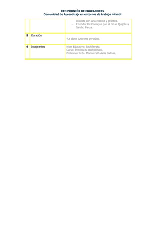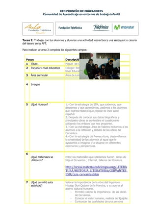 Este documento describe una actividad interactiva realizada con estudiantes de primer año de bachillerato sobre la obra del escritor Miguel de Cervantes. La actividad consistió en 1) pedir a los estudiantes que expresen lo que conocen sobre el autor, 2) contestar un cuestionario sobre su biografía y obras principales utilizando enlaces en línea, 3) reflexionar y debatir sobre las obras de Cervantes usando la estrategia de línea de valores, y 4) desarrollar la creatividad de los estudiantes mediante pre-es