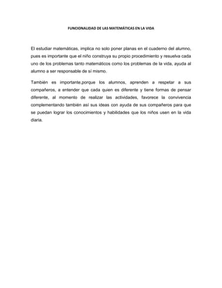 Este documento describe el pensamiento matemático en diferentes niveles educativos, desde preescolar hasta secundaria. En preescolar, el objetivo es que los niños usen conceptos básicos como el conteo y reconozcan la importancia de los números en la vida diaria. En primaria, se enfoca en el lenguaje aritmético, algebraico y geométrico para interpretar información y medir. En secundaria, comprende la transición del razonamiento intuitivo al educativo para representar y analizar información. Además, explica que estudiar