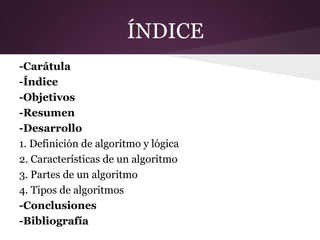 Este documento presenta la definición de algoritmo y lógica, las características y partes de un algoritmo, y los tipos de algoritmos. El objetivo es que los estudiantes conozcan estos conceptos fundamentales de algoritmos y lógica de programación.