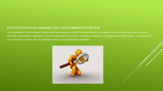 Las estrategias para indagar conocimientos previos incluyen lluvia de ideas, preguntas, SQA (Qué sé, Qué quiero aprender, Qué aprendí), RA-RP (Respuesta anterior, Respuesta posterior). Estas estrategias ayudan a identificar las ideas y concepciones de los estudiantes sobre un tema. Organizadores gráficos como cuadros sinópticos, diagramas de flujo y mapas conceptuales pueden utilizarse para organizar la información de manera que promueva la comprensión.
