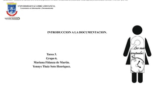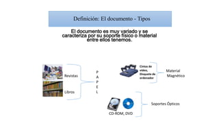 El documento describe los diferentes tipos de documentos, incluyendo su soporte físico como libros, revistas, cintas de video, disquetes, CD-ROM y DVD. También habla sobre documentos digitales y cómo la tecnología ha permitido que los documentos no tengan fronteras físicas. Explica brevemente diferentes sistemas de clasificación de documentos como la clasificación alfabética, sistemática, el sistema expansivo de Cutter, la clasificación decimal de Dewey, entre otros. Finalmente, distingue entre fuentes primarias como libros
