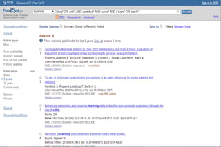 El documento describe la tarea del seminario III que implica realizar una búsqueda en la base de datos PubMed sobre artículos publicados en los últimos cinco años sobre cómo los blogs y wikis contribuyen a la enseñanza y el aprendizaje en enfermería. Propone dos estrategias de búsqueda usando términos clave como "blog", "wiki", "contribución", "enfermería", "aprender" y "enseñar". El resultado incluirá referencias bibliográficas y textos completos de los artículos encontrados.