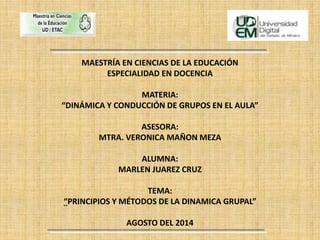 Este documento trata sobre los principios y métodos de la dinámica grupal en el aula. Explica que las técnicas grupales pueden fortalecer el aprendizaje de los estudiantes al permitir que construyan conocimiento juntos y se sientan parte de un grupo. Luego describe varias técnicas de grupo, principios de conducta social, tipos de crisis en los estudiantes y elementos del psicoanálisis que son relevantes para la dinámica grupal. Concluye que usar una variedad de dinámicas grupales puede integrar a los estud