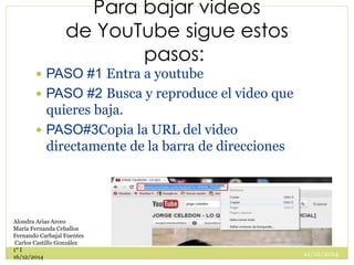 El documento describe 9 pasos para guardar videos de YouTube en el disco duro: 1) ir a YouTube y reproducir el video, 2) copiar la URL, 3) pegar la URL en el sitio Force Downlad, 4) seleccionar el formato MP4, 5) hacer clic en Continuar sin registrar, 6) esperar a que se complete la conversión, 7) hacer clic en Descargar MP4, 8) guardar el archivo en el disco duro, 9) esperar a que se descargue el video.