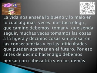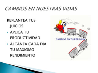 Este documento habla sobre la importancia de replantear nuestros juicios, aplicar nuestra productividad y alcanzar nuestro máximo rendimiento cada día, ya que los cambios en nuestra persona pueden construir o destruir relaciones y proyectos. Recomienda no emitir malos juicios sobre los demás, tener valores que nos hagan personas únicas e invertir en conocimiento e iniciativa para dar lo mejor de nosotros mismos y alcanzar nuestros objetivos profesionales.