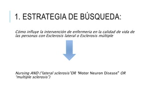 El documento describe los pasos realizados para buscar información sobre cómo la intervención de enfermería influye en la calidad de vida de personas con esclerosis lateral o esclerosis múltiple. Se utilizaron las bases de datos Scopus y CINAHL, aplicando filtros como tipo de documento (artículos) y años de publicación (últimos 15 años). Los artículos se exportaron a Mendeley y se insertaron las citas y bibliografía en Word.