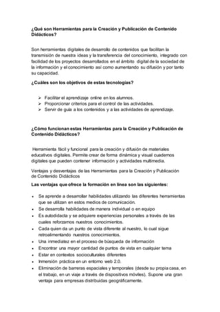 El documento describe varias herramientas para la creación y publicación de contenido didáctico digital. Explica que estas herramientas facilitan la transmisión de ideas y el aprendizaje en línea. También describe objetivos como facilitar el aprendizaje en línea y proporcionar guías para las actividades educativas. Menciona varias herramientas como eXeLearning y sus características.