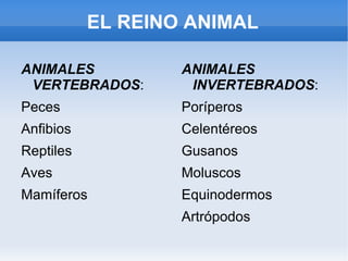 El documento clasifica los animales en vertebrados e invertebrados, describiendo las características principales de cada grupo. Los vertebrados tienen un esqueleto interno óseo o cartilaginoso y una columna vertebral, mientras que los invertebrados suelen ser más pequeños y carecen de esqueleto óseo. Dentro de los vertebrados, se mencionan peces, anfibios, reptiles, aves y mamíferos, dividiendo a estos últimos en carnívoros, herbívoros, voladores, acuáticos y pri