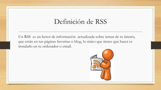 Este documento define RSS como un lector de información actualizada sobre temas de interés que están en páginas web y blogs favoritos. Explica que los lectores RSS actualizan automáticamente la información más reciente de los sitios suscritos. Detalla los pasos para instalar un lector RSS y suscribirse a los feeds RSS de los sitios deseados para empezar a recibir noticias frescas. Finalmente, menciona algunos lectores RSS populares.