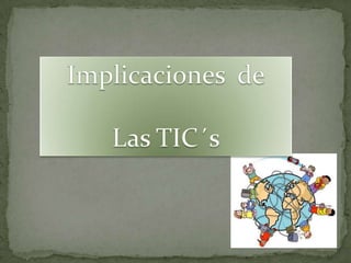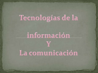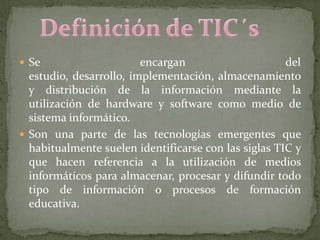 Las tecnologías de la información y la comunicación (TIC) se encargan del estudio, desarrollo, implementación y distribución de la información a través de hardware y software. Han permitido unir lazos entre personas y el mundo, eliminando barreras de tiempo y distancia. Si bien las TIC ofrecen ventajas, también comportan riesgos como limitar habilidades sociales o disminuir la actividad física cuando se usan de forma excesiva.