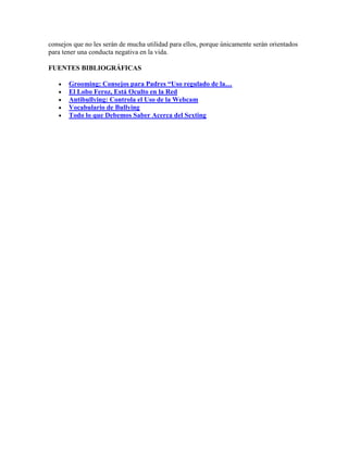 El documento habla sobre los peligros del grooming o acoso sexual a través de Internet, especialmente para menores. Este fenómeno ocurre cuando adultos se hacen pasar por niños para ganarse su confianza y pedirles fotos o videos íntimos, llegando a abusar sexualmente de ellos. Los padres deben educar a sus hijos sobre estos riesgos, supervisar su uso de la red y enseñarles a no compartir información personal con desconocidos.