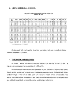 El documento resume el gasto energético total diario de una persona de 56 kg que realiza actividades como dormir, ducharse, cocinar, conducir y hacer ejercicio moderado. Calcula que gasta un total de 2,331 kcal por día, ligeramente más que la ingesta recomendada de 2,300 kcal para su actividad moderada. Reconoce que sus actividades varían día a día, por lo que su gasto energético promedio es consistente con las recomendaciones.