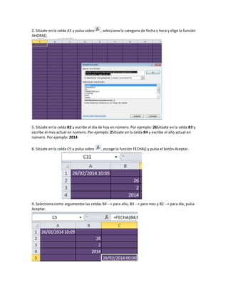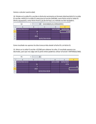 El documento proporciona instrucciones para insertar fechas actuales y calcular la edad de una persona en Excel. Las instrucciones incluyen usar las funciones AHORA(), FECHA(), DIAS360() y ENTERO() para obtener la fecha actual, combinar fechas de cumpleaños y hoy, calcular los días transcurridos entre fechas y convertirlos a años.