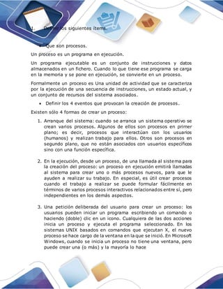 Los sistemas operativos Unix, Linux y Windows gestionan los procesos de forma jerárquica, asignando un identificador único a cada proceso y vinculándolos a través de su proceso padre. Cada proceso tiene recursos, directorios y permisos asociados que son administrados y monitoreados por el núcleo del sistema operativo. Existen comandos y herramientas para visualizar, controlar y dar soporte a los procesos en ejecución.