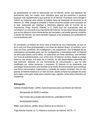 Este documento resume la historia del desarrollo de Internet. Explica que Internet se convirtió en una tecnología establecida en 1985, pero solo era accesible para científicos. En 1989, Tim Berners-Lee propuso el World Wide Web para hacer Internet más visual y amigable al usuario. El navegador Mosaic y luego Internet Explorer de Microsoft popularizaron el acceso a Internet. Compañías como Google y Yahoo crearon buscadores web que permitieron a las personas encontrar información más fácilmente y eventualmente se convirtieron en herramientas de mercadeo.