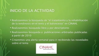 Este documento proporciona instrucciones para realizar una búsqueda bibliográfica sobre el tratamiento y rehabilitación de la tendinosis en el tenis y baloncesto en la base de datos CINAHL. Las instrucciones incluyen buscar términos en inglés y sinónimos en el tesauro DECS, realizar búsquedas libres y por descriptores en CINAHL desde 2010, y crear una alerta semanal para recibir actualizaciones sobre el tema.