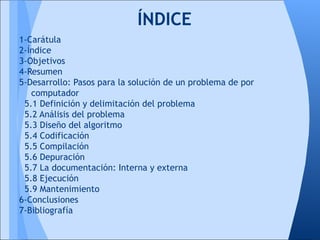 Este documento describe los nueve pasos para resolver un problema por computadora: 1) definir y delimitar el problema, 2) analizar el problema, 3) diseñar el algoritmo, 4) codificar, 5) compilar, 6) depurar, 7) documentar, 8) ejecutar, y 9) mantener. Cada paso se define brevemente, incluyendo su propósito y características clave.