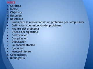 Este documento presenta los pasos para desarrollar un programa por computador, que incluyen: 1) definición y delimitación del problema, 2) análisis del problema, 3) diseño del algoritmo, 4) codificación, 5) compilación, 6) depuración, 7) documentación, 8) ejecución y 9) mantenimiento. El objetivo es determinar el proceso para resolver un problema usando una computadora y comprender las diferentes formas de representar un algoritmo para encontrar la mejor solución.