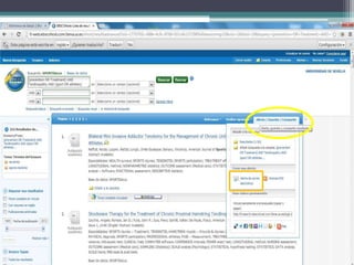 El documento habla sobre las competencias informacionales en ciencias de la salud. Menciona CINAHL y SPORTDiscus como bases de datos importantes para encontrar información relevante en esta área. También menciona iniciar sesión para crear alertas sobre nuevos artículos.