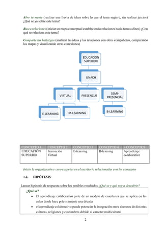Este documento presenta un plan para buscar y organizar información sobre la aplicación del aprendizaje colaborativo en la Universidad Nacional de Chimborazo. El objetivo es conocer la situación actual del aprendizaje colaborativo en la asignatura de Infopedagogía y su impacto en la formación de estudiantes. Se establecen los conceptos clave, las fuentes de información a consultar, y los criterios y estrategias para realizar la búsqueda en un plazo de un mes. El documento proporciona una guía detallada para l