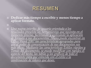 El documento habla sobre las nuevas características de formato en Microsoft Word 2007 que permiten aplicar formato a documentos de manera más rápida y eficiente. Estas características incluyen Estilos rápidos y Temas del documento, las cuales permiten modificar fácilmente el aspecto de texto, tablas y gráficos en todo el documento para coincidir con el estilo deseado. La nueva interfaz de Word 2007 presenta herramientas que facilitan la aplicación de formato sin distraer del tiempo dedicado a escribir.