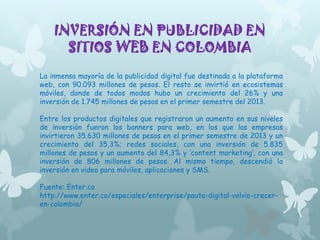 El documento describe la evolución de la inversión en publicidad digital en Colombia. Reporta que entre 2012 y el primer semestre de 2013, la inversión en publicidad digital en Colombia creció un 37.7%. La mayoría de la inversión se destinó a publicidad en sitios web, con un crecimiento del 26% en publicidad móvil. Dentro de los formatos publicitarios digitales que más crecieron se encuentran los banners para web, redes sociales y contenido patrocinado.