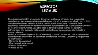 El documento aborda los aspectos éticos y legales relacionados con la información digital, centrándose en los derechos de autor y su reconocimiento como derechos humanos fundamentales. También se discuten dimensiones morales como derechos de propiedad, responsabilidad y control, junto con la calidad del sistema y de vida. Se enfatiza la importancia de la ética en la conducta humana y su relación con el acceso y uso de la información digital.