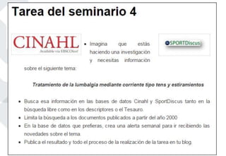 Este documento describe cómo usar las bases de datos CINAHL y SPORTDiscus para buscar información sobre lumbalgia, estimulación eléctrica nerviosa transcutánea y ejercicios de estiramiento muscular. Explica cómo acceder a las bases de datos a través de la Biblioteca de Centros de Salud, realizar búsquedas libres y por descriptores, guardar documentos en carpetas personales y crear alertas de búsqueda por correo electrónico.