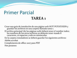 Este documento presenta las tareas para el segundo parcial de la carrera de idiomas en la Universidad Técnica de Ambato. Incluye cuatro tareas: 1) crear una guía de instalación y uso de Dropbox, 2) crear una guía de instalación del programa SWISH, 3) elaborar un currículo personal en SWISH, y 4) crear un blog individual con encuestas, fotos, presentaciones y un video.