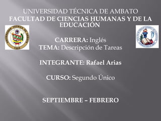 Este documento describe las tareas asignadas para un curso de inglés en la Universidad Técnica de Ambato. Las tareas incluyen crear una guía de instalación del programa Hot Potatoes y archivos adjuntos, elaborar guías de funcionamiento y ejercicios para los subprogramas de Hot Potatoes, crear una presentación sobre un libro electrónico, elaborar guías para Dropbox y Swish, crear currículos personales en Swish, y construir un blog individual con encuestas, fotos, presentaciones y un video.
