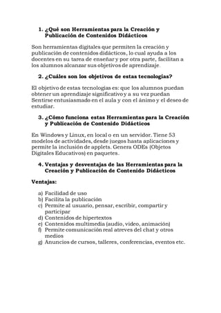 Este documento describe diferentes herramientas para la creación y publicación de contenidos didácticos digitales. Explica que estas herramientas permiten a los docentes crear y compartir materiales de aprendizaje de forma fácil. Luego menciona 10 herramientas populares como Ardora, Constructor, Cuadernia y EXeLearning, resaltando sus características. Finalmente, proporciona una descripción detallada de EXeLearning, incluidas sus funciones, importancia y actividades.