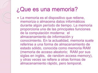 El documento describe varios componentes y periféricos de una computadora. Explica que la memoria almacena datos de forma temporal, las tarjetas cumplen funciones específicas como gráficos o red, la CPU procesa instrucciones, y los puertos permiten la transmisión de datos. También define términos como bus de datos, motherboard, procesadores, hercios, gigahercios y fuente de poder. Por último, explica los periféricos multimedia como micrófonos, auriculares y webcam, así como los tipos de información multimedia