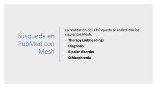 El documento describe una búsqueda en PubMed utilizando términos MeSH como "Diagnosis", "Bipolar disorder", "Schizophrenia" y "Therapy". La búsqueda resultante fue ("Diagnosis OR therapy") AND ("Bipolar disorder" OR "Schizophrenia"). Se aplicaron filtros para artículos entre 2015-2017 sobre adolescentes y de revisión. Diez artículos fueron seleccionados e importados a Mendeley, y la bibliografía fue copiada en formato Harvard. El documento también describe cómo localizar el texto completo de uno de los artículos