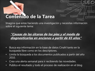 Este documento describe los pasos realizados para buscar información sobre las causas y el diagnóstico de úlceras de los pies en ancianos mayores de 65 años en la base de datos Cinahl. Incluye una búsqueda libre utilizando términos clave y la creación de una alerta semanal, así como una búsqueda controlada mediante descriptores de Cinahl y la aplicación de filtros de fecha y grupo de edad. El objetivo final es publicar los resultados de la investigación en un blog.