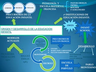 El documento presenta un resumen de los precursores y el desarrollo de la educación infantil. Comienza con los principales precursores como Comenio, Rousseau y Pestalozzi en los siglos XVII-XVIII y continúa describiendo las primeras instituciones de educación infantil como la Escuela Infantil de Owen en el siglo XIX. Luego detalla algunos modelos pedagógicos actuales de educación infantil como Montessori, High Scope y Reggio Emilia.