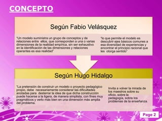 El documento presenta diferentes conceptos de modelo pedagógico según varios autores. Un modelo pedagógico representa una teoría educativa y permite organizar los contenidos académicos, la didáctica y las normas de relación. Los modelos pedagógicos incluyen componentes como el objetivo, contenido, método, didáctica, medios y evaluación. Algunos modelos mencionados son el tradicional, conductista, desarrollista y social.