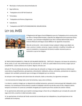 El documento resume los principales puntos de la ley del Instituto del Fondo Nacional de la Vivienda para los Trabajadores (INFONAVIT). Describe los objetivos del Instituto, las obligaciones de los patrones como la inscripción de trabajadores y el pago de aportaciones, y los derechos de los trabajadores como elegir su vivienda y realizar aportaciones voluntarias a su cuenta individual. También cubre aspectos como el financiamiento para la construcción de vivienda para trabajadores y las reglas para el otorgamiento de créditos.