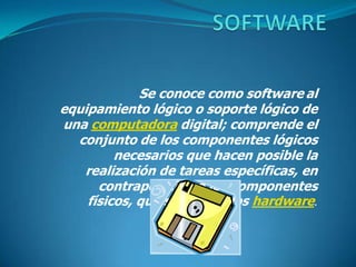 Este documento presenta una introducción al software, incluyendo su definición, clasificación y el proceso de creación. Define el software como el conjunto de programas, procedimientos, reglas, documentación y datos asociados a un sistema computacional. Clasifica el software en sistemas operativos, de programación, y aplicaciones. Describe las etapas generales del proceso de creación de software, incluyendo análisis de requisitos, diseño, implementación, pruebas e implementación.