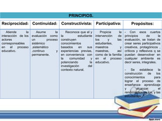 Este documento describe los diversos criterios del proceso de evaluación en una universidad venezolana, incluyendo principios como la reciprocidad, continuidad y participación, así como tipos de evaluación inicial, formativa y final. Explica características como ser científica, flexible y personalizada, además de funciones como explorar, diagnosticar y orientar. El objetivo es formar estudiantes responsables, críticos y capaces de construir sus propios conocimientos.