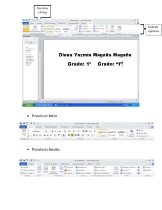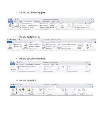 Este documento describe las características principales de Microsoft Word, incluyendo pestañas y grupos para diferentes funciones como Inicio, Insertar, Diseño de página, Referencias, Correspondencia y Revisar. También describe elementos como la cinta de opciones, barras de herramientas, estilos de texto, tablas, márgenes, portadas y más.