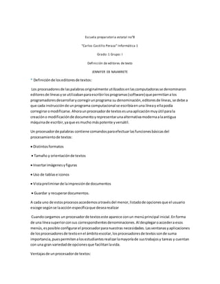 Los editores de texto, originalmente llamados editores de líneas, permiten crear y modificar documentos de manera más potente y versátil que una máquina de escribir. Contienen opciones para distintos formatos, tamaños de texto, imágenes, tablas e iconos. Esto facilita que los estudiantes realicen sus tareas y trabajos, pudiendo editarlos cuantas veces quieran mediante funciones como cortar, pegar y modificar texto.