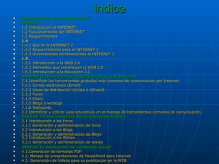 El documento abarca la evolución de Internet desde su creación hasta su uso actual en la educación, destacando la importancia de herramientas de comunicación como correos electrónicos, foros, y blogs. También explora la generación de contenido visual utilizando formatos como PDF, PowerPoint y videos para su publicación en la web. Enfatiza la colaboración y el trabajo en red, resaltando cómo estas tecnologías han transformado la interacción en entornos educativos.