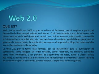 El documento habla sobre Web 2.0. Explica que Web 2.0 se refiere al desarrollo de aplicaciones en Internet que permiten una mayor interacción entre usuarios, como publicar contenido y comentar el contenido de otros. Menciona algunas plataformas clave de Web 2.0 como blogs, redes sociales, Wikipedia y servicios de alojamiento de fotos y videos. Finalmente, indica que la esencia de estas herramientas es permitir la interacción entre usuarios y el enriquecimiento de la experiencia a través del contenido que aportan los