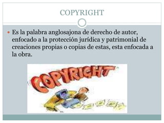 El documento trata sobre los conceptos de copyright, derecho de autor y propiedad intelectual. Explica que el copyright protege las obras originales y sus copias, mientras que el derecho de autor protege las creaciones literarias, artísticas y otras por un período después de la muerte del creador. La propiedad intelectual protege todas las creaciones mentales de creadores nacionales y extranjeros. También brinda instrucciones básicas sobre cómo citar páginas web en trabajos de investigación.