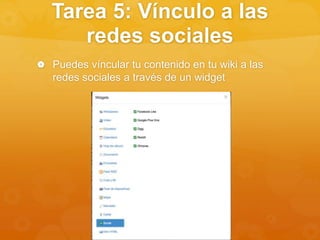 El documento habla brevemente sobre cómo vincular contenido de una wiki a las redes sociales a través de un widget, permitiendo compartir el contenido fácilmente en plataformas como Facebook, Twitter u otras.