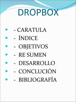 Este documento proporciona una descripción general de las características principales de Dropbox. Explica que Dropbox es un software que sincroniza archivos en línea y entre dispositivos, permitiendo que los archivos estén siempre actualizados en todos los equipos. También permite compartir archivos fácilmente y realiza copias de seguridad automáticas de los archivos en los servidores de Dropbox. Además, permite recuperar versiones anteriores de archivos.