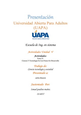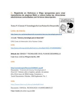 Este documento presenta información sobre ciencia y tecnología en países en desarrollo. Explica cinco factores de vinculación entre ciencia, tecnología y desarrollo como apropiación social, generación de conocimiento, producción, cambio social y desarrollo sostenible. También discute objetivos de ciencia y tecnología en países en desarrollo, generación de conocimiento, producción, conocimiento y cambio social, y diversidad biológica. Finalmente, presenta información sobre políticas de ciencia y tecnología.