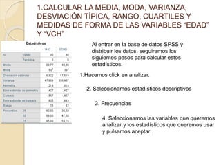 El documento detalla un análisis estadístico de las variables 'edad' y 'vch', incluyendo cálculos de media, moda, varianza y gráficos descriptivos. Se observa que la media de 'vch' es 88.77 y la de 'edad' es 48.30, además de frecuencias y gráficos que muestran diferencias de vch entre sexos. También se presenta una tabla de contingencia que muestra similitudes y picos en la asistencia de hombres y mujeres según la edad.