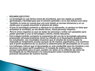 El documento discute la tecnología que debería aplicarse en las instituciones educativas en los próximos 3 años. Propone el uso de medios audiovisuales, como videos e interactivos; plataformas de aprendizaje virtual; y herramientas para facilitar el aprendizaje remoto. Esto complementaría la tecnología existente y mejoraría el rendimiento estudiantil de manera flexible.