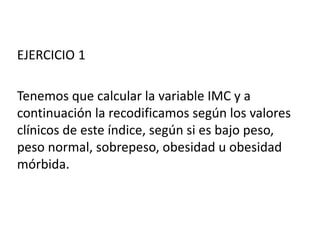 Este documento describe dos ejercicios realizados con un conjunto de datos sobre la salud sexual. En el primer ejercicio, se calcula el índice de masa corporal de los individuos y se recodifica según valores clínicos. En el segundo ejercicio, se crea una variable que mide el riesgo sexual agregando variables sobre conductas sexuales de riesgo, y luego se recodifica esta variable para indicar alto o bajo riesgo.